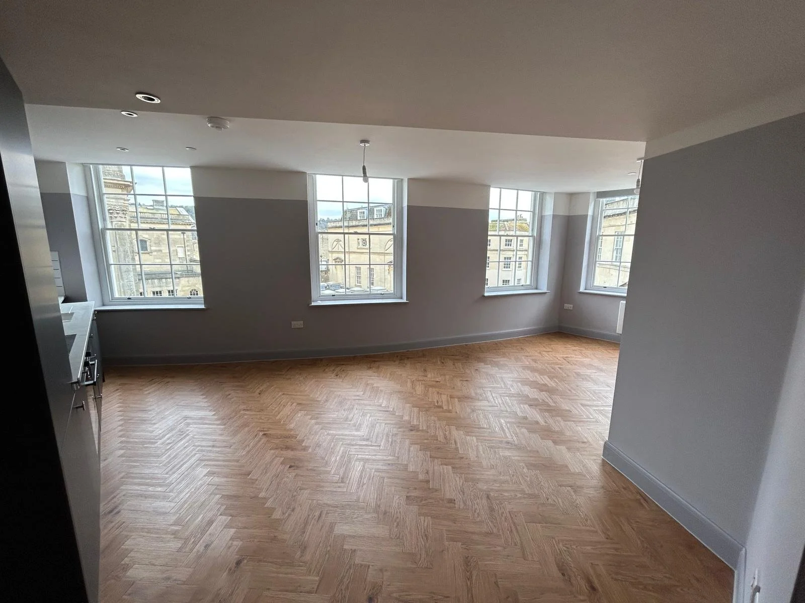 Three original 2-bed, 2-bath flat with good floors but grey walls and a dull atmosphere. The goal: turn it into a luxury stay, despite its challenges — small bedrooms, curving walls, and an unconventional layout.
