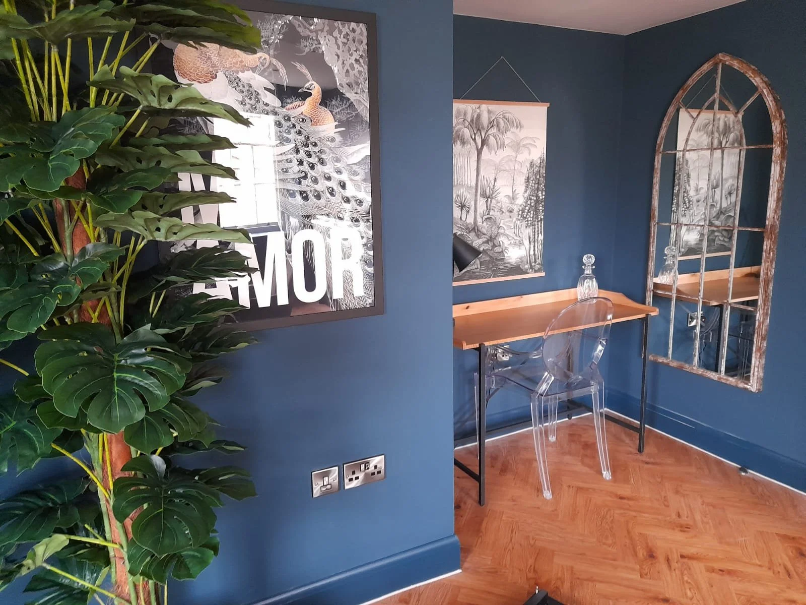 As promised, Sophie transformed the space with deep dark blue walls contrasting the varnished wooden floors and introduced new furniture to bring it to life.
