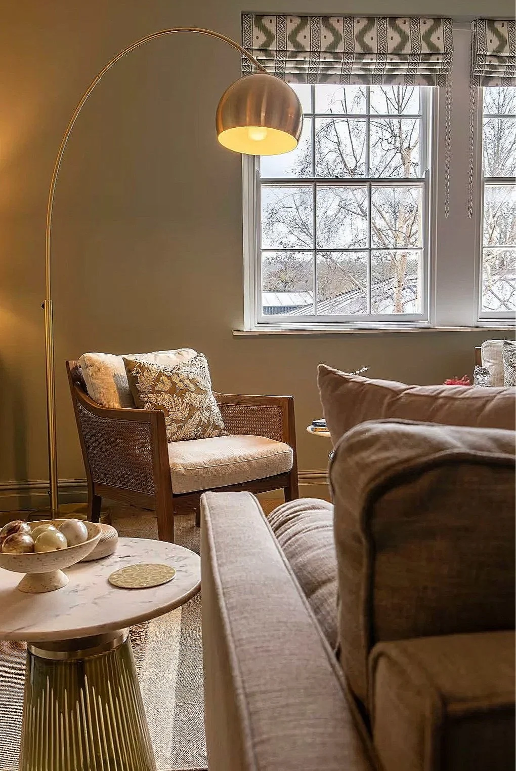 The lounge was once weighed down by clashing wallpaper, mismatched décor, and outdated accents, but once stripped back it gave Sophie the perfect blank canvas. Removing the wallpaper and repainting the walls around the original fireplace in the same blue hue used throughout the property created a cohesive feel. Original artwork, brass lighting, and vintage upholstered chairs and sofas—paired with textured accent cushions, brought the room together into a warm, stylish space truly worth living in.